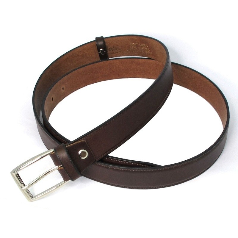 Brązowy klasyczny pasek do garnituru z delikatną imitacją obszycia. Dostępny w 10 rozmiarach (od 80 do 125)